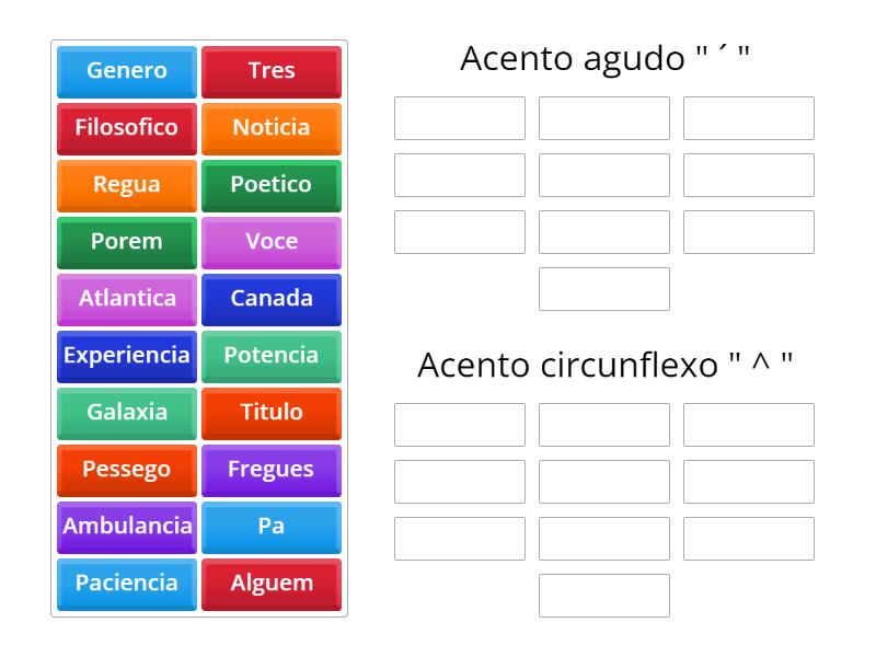 Acento agudo " ´ ": Pa, Noticia, Canada, Galaxia, Poetico, Porem, Titulo, Alguem, Regua, Filosofico, Acento circunflexo " ^ ": Experiencia, Fregues, Voce, Paciencia, Ambulancia, Pessego, Atlantica, Potencia, Genero, Tres,