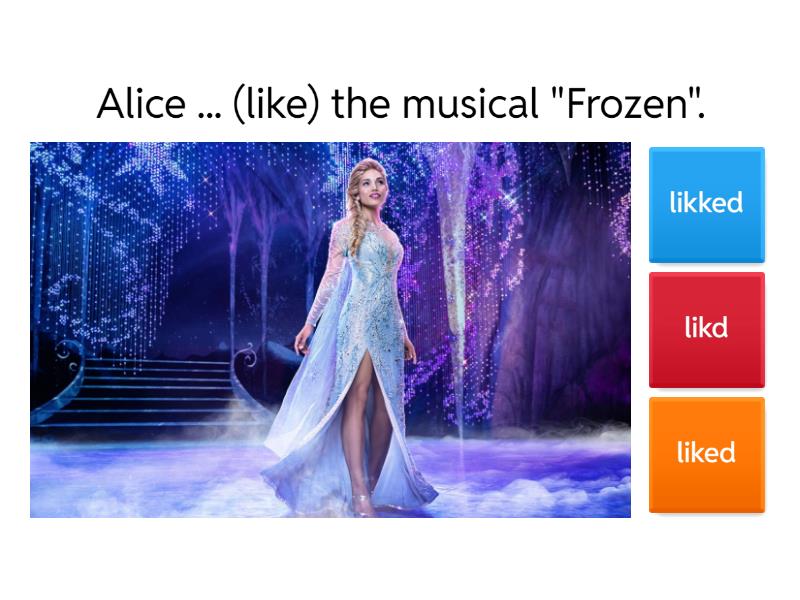 1) Alice ... (like) the musical "Frozen". a) likked b) likd c) liked 2) Jim ... (visit) his grandmother yesterday. a) visited b) visitted c) visitd 3) Molly ... (cry) two hours ago. a) cryed b) cred c) cried 4) He ... (slip) on the wet floor. a) sliped b) slipped c) slipied 5) The Smith family ... (live) in a beautiful house in 1976. a) liveed b) lived c) livied 6) They ... (enjoy) travelling a lot five years ago. a) enjoyed b) enjoied c) enjoed 7) Bob, Matt, and Sophie ... (watch) football last Monday. a) watchd b) watched c) watches 8) I ... (play) hockey yesterday. a) plaied b) playd c) played 9) Her car ... (stop) a minute ago. a) stoped b) stoppd c) stopped 10) Molly ... (study) hard for her exams yesterday. a) studied b) studed c) studyed
