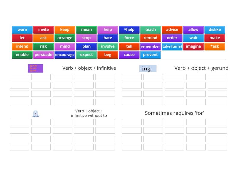 Verb + object + infinitive: advise, allow, ask, beg, cause, enable, encourage, expect, force, help, intend, invite, mean, order, persuade, remind, take (time), teach, warn, tell, Verb + object + gerund: dislike, hate, imagine, involve, keep, mind, prevent, remember, risk, stop, Verb + object + infinitive without to: let, make, *help , Sometimes requires 'for': arrange, plan, wait, *ask,