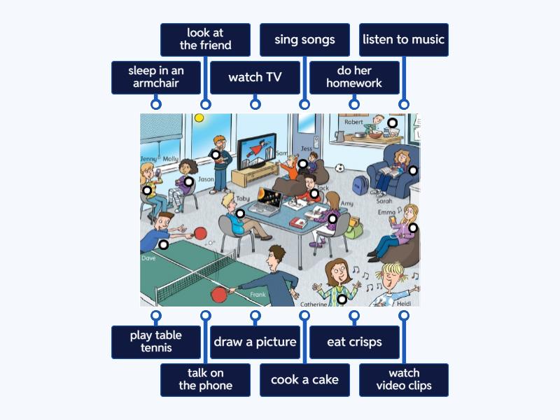 cook a cake, sleep in an armchair, do her homework, listen to music, sing songs, watch video clips, play table tennis, eat crisps, watch TV, draw a picture, talk on the phone, look at the friend.