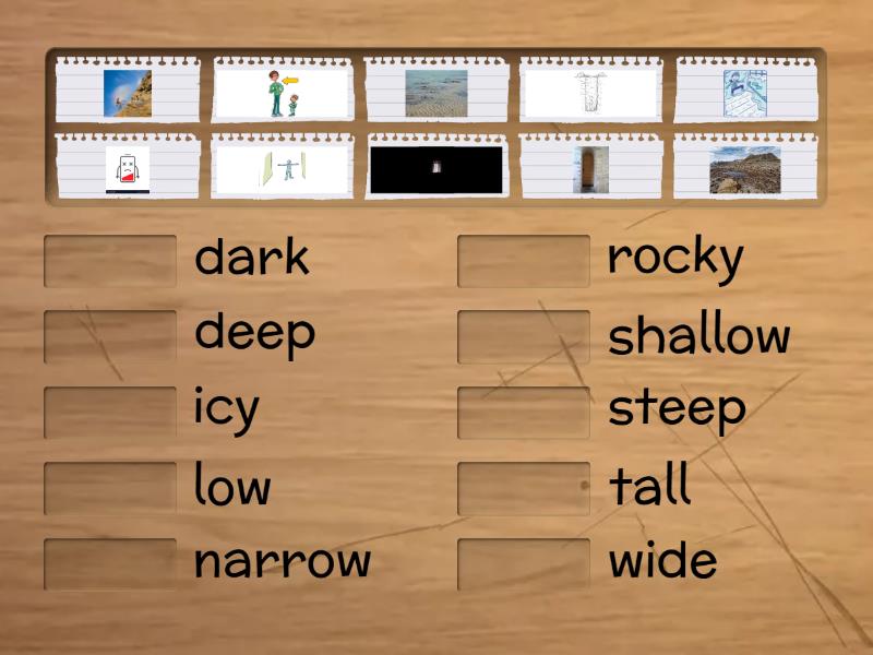 dark, deep, icy, low, narrow, rocky, shallow, steep, tall, wide,
