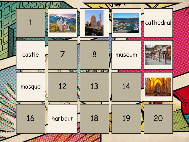 castle, cathedral, harbour, mosque, museum, temple, tower, statue, market, palace,