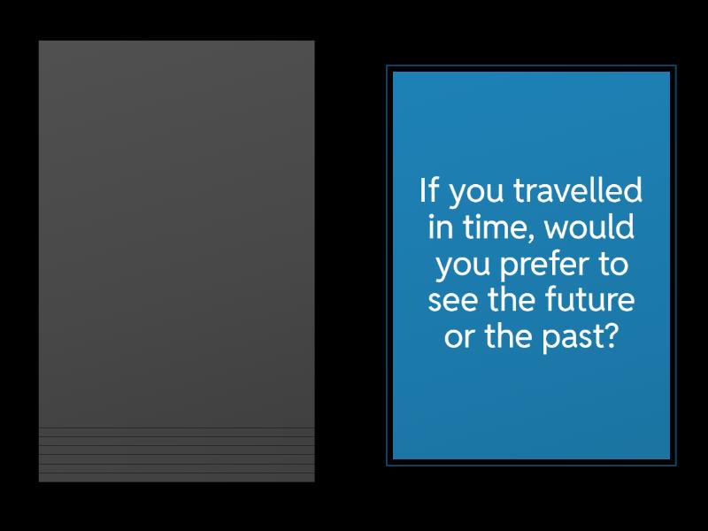 If you could only eat one food for the rest of your life, what would you choose?, If you changed your name, what name would you choose?, If you travelled in time, would you prefer to see the future or the past?, If you didn’t need sleep, how would you spend your nights?, If you had any job, what job would you like to have?, If you changed one thing about the world today, what would you change?, If you met a famous person, dead or alive, who would you choose to meet?, If you had the choice to be stuck on an island alone or with someone you hate, what would you choose?.