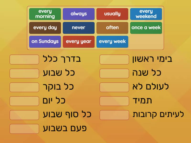 every day - כל יום, once a week - פעם בשבוע, usually - בדרך כלל, often - לעיתים קרובות, every year - כל שנה, never - לעולם לא, always - תמיד, every week - כל שבוע, every morning - כל בוקר, on Sundays - בימי ראשון, every weekend - כל סוף שבוע,