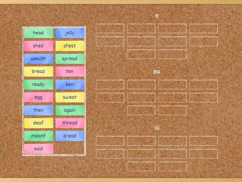 e: ben, egg, ten, then, shed, jelly, chest, ea: bread, deaf, dread, head, meant, ready, spread, sweat, thread, wealth, ai: again, said,