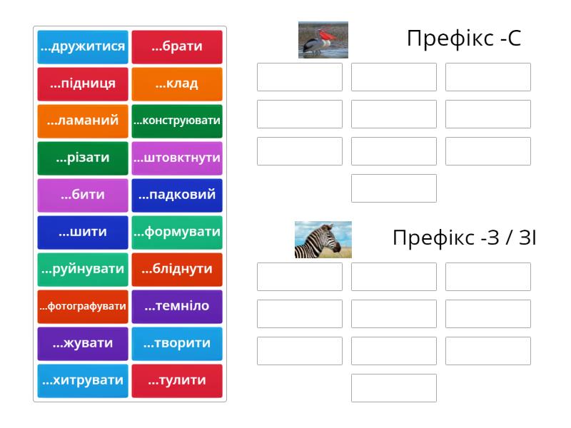 Префікс -С: ...падковий, ...творити, ...підниця, ...клад, ...фотографувати, ...хитрувати, ...конструювати, ...тулити, ...темніло, ...формувати, Префікс -З / ЗІ: ...дружитися, ...руйнувати, ...шити, ...жувати, ...бліднути, ...бити, ...різати, ...ламаний, ...брати, ...штовктнути,