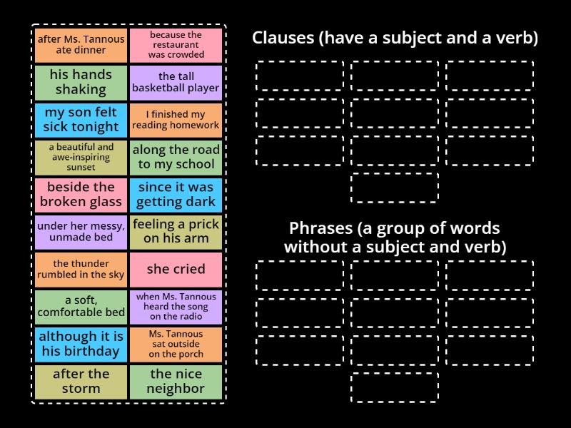 Clauses (have a subject and a verb): the thunder rumbled in the sky, after Ms. Tannous ate dinner, because the restaurant was crowded, Ms. Tannous sat outside on the porch, since it was getting dark, my son felt sick tonight, although it is his birthday, I finished my reading homework, when Ms. Tannous heard the song on the radio, she cried, Phrases (a group of words without a subject and verb): beside the broken glass, after the storm , the nice neighbor, his hands shaking, along the road to my school, a soft, comfortable bed, feeling a prick on his arm, a beautiful and awe-inspiring sunset, the tall basketball player, under her messy, unmade bed,