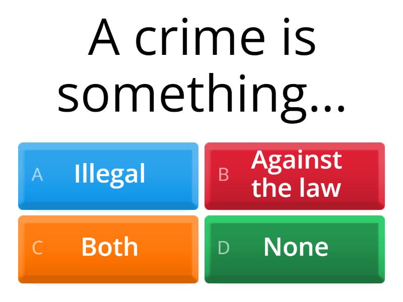 1) A crime is something... a) Illegal b) Against the law c) Both d) None 2) Someone who commits a crime is called a a) victim b) criminal c) hooligan 3) Someone who has a crime commited against them is often called a a) victim b) offender c) criminal 4) An alternative name for a criminal is an a) illegal b) victim c) offender 5) Perception means a) our opinion b) the truth c) fact 6) Consume means a) to act b) to make c) to take 7) Produce means a) to act b) to make c) to take 8) What can make a place safer? a) Alarm b) Lighting c) Police d) All e) None 9) Neighbourhood watch is a) where local residents keep an eye out for each other b) CCTV c) where police come and watch your house 10) Neighbourhood watch and CCTV all help reduce crime because a) criminals think someone might be watching them b) no one is watching them 11) Conflict means that people disagree with each other. Sometimes there is violence. a) True b) False 12) Which is the odd one out? a) Culprit b) Victim c) Offender d) Criminal 13) Which is the odd one out? a) Vandalism b) Graffitti c) Environmental damage d) Drug addict 14) Which countries produce opium? a) Burma b) Afghanistan c) Both d) None 15) Which continents consume opium? a) Europe b) Americas c) Asia d) Afirica 16) What is Afganistan like? a) conflict and war b) Calm and safe 17) The weather in Afghanistan is good for growing poppies (Opium) because a) it is hot and dry b) it is warm and wet 18) The countries that poroduce Cocaine are... a) Bolivia, Columbia, and Equador b) Brazil, Columbia and Equador c) Bolivia, Canada and Equador 19) The countries that produce cocaine are a) hot and wet b) warm and dry c) cold and wet 20) Where is cannabis made? a) Carribbean b) America c) Afghanistan 21) How do the drugs get here? a) Boat b) Plane c) Smuggled d) Over land e) All of the above f) None of the above 22) Which countries do drugs often travel throught? a) Iran and Turkey b) Iraq and Turkey c) Tunisia and Iran d) Tunisia and Iraq 23) People think there is high crime in a) Farley b) Lewsey c) High Town d) All of above e) None of above 24) Crime data shows that there is actually high crime in a) South b) Dallow c) Lewsey d) All of the above e) none of the above 25) Where people think there is high crime is not always where crime is high. Opinion is not the same as fact. a) True b) False