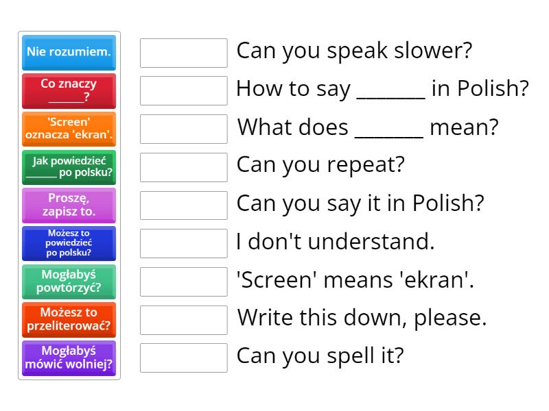 Mogłabyś powtórzyć? - Can you repeat?, Proszę, zapisz to. - Write this down, please., Nie rozumiem. - I don't understand., Mogłabyś mówić wolniej? - Can you speak slower?, Możesz to przeliterować? - Can you spell it?, Co znaczy _______? - What does _______ mean?, Jak powiedzieć _______ po polsku? - How to say _______ in Polish?, Możesz to powiedzieć po polsku? - Can you say it in Polish?, 'Screen' oznacza 'ekran'. - 'Screen' means 'ekran'.,