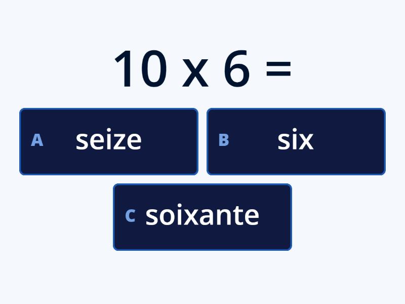 1) 10 x 6 =  a) seize b) six c) soixante 2) 85 - 50 = a) trente-cinq b) cinq c) trois 3) 16 - 8 = a) sept b) dix-huit c) huit 4) 40 + 33 a) dix-sept b) soixante-six c) soixante-treize 5) 99 - 95= a) quatorze b) quatre c) quarante 6) 4 x 22 = a) quarante-quatre b) quatre-vingt-quatre c) quatre-vingt-huit 7) 12 x 3 = a) soixante b) trente c) trente-six 8) 5 x 20 = a) vingt-cinq b) cent c) cinquante 9) 59 - 20 = a) vingt-neuf b) trente-neuf c) dix-neuf 10) 41 + 41 = a) quarante-deux b) quatre-vingt-douze c) quatre-vingt-deux 11) cent - cinquante = a) cinquante b) soixante c) trente 12) Deux + trente = a) trente-et-un b) trente-deux c) trente-trois 13) trois + quatorze = a) dix-huit b) trente-quatre c) dix-sept 14) cinquante - vingt = a) treize b) trente c) trois 15) soixante-dix - vingt-cinq a) quarante-cinq b) trente-cinq c) soixante-cinq