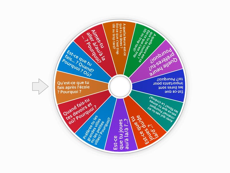 1) Est-ce que tu fais...  ? Quand? Pourquoi ? Où? 2) Aimes-tu aller à/au/à la ...  ? Pourquoi? 3) A quelle heure est-ce que tu te lèves ? Est-ce que c'est trop tôt ou trop tard? 4) A quelle heure est-ce que tu te couches ? Est-ce que c'est trop tôt ou trop tard? 5) Quelle heure préfères-tu?  Pourquoi? 6) Est-ce que les livres sont importants pour toi? Pourquoi? 7) Avec qui vas-tu au cinéma? Pourquoi est-ce que tu aimes les films? Le cinéma? 8) Est-ce que tu joues du/de la/d'..? 9) Est-ce que tu joues au/à la/à l'..? 10) Préfères-tu les grandes villes ou les petites villes? Pourquoi? 11) Quand fais-tu tes devoirs et où? Pourquoi ? 12) Qu'est-ce que tu fais après l'école ? Pourquoi ?