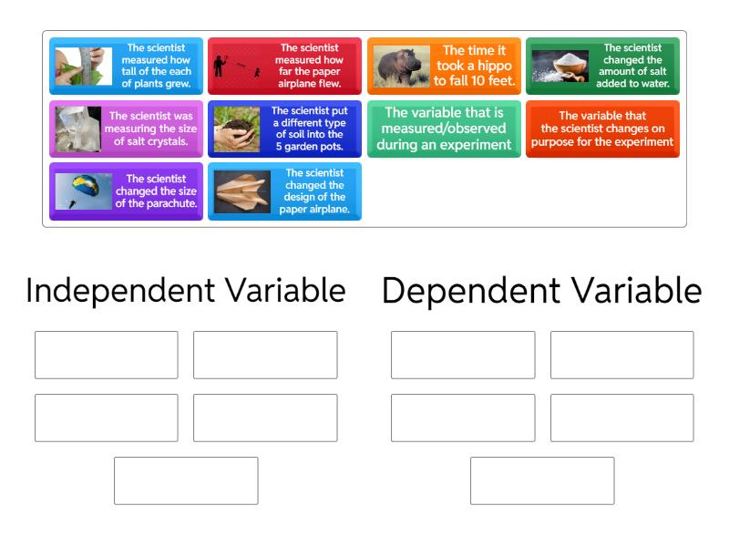 Independent Variable : The variable that the scientist changes on purpose for the experiment, The scientist changed the size of the parachute. , The scientist changed the amount of salt added to water., The scientist changed the design of the paper airplane., The scientist put a different type of soil into the 5 garden pots. , Dependent Variable : The variable that is measured/observed during an experiment, The time it took a hippo to fall 10 feet., The scientist was measuring the size of salt crystals., The scientist measured how far the paper airplane flew. , The scientist measured how tall of the each of plants grew. ,