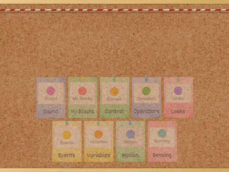 Motion - ควบคุมการเคลื่อนไหว, Looks - แสดงลักษณะ ท่าทาง การพูด, Sound - ควบคุมการทำงานด้านเสียง, Events - กำหนดค่าเหตุการ์และการกระทำ, Control - ลักษณะการกระทำและควบคุม, Sensing - ตรวจจับลักษณะและการกระทำ, Operators - สร้างตัวดำเนินการ เงื่อนไข, Variables - การสร้างตัวแปร, My Blocks - บล็อคของฉัน,