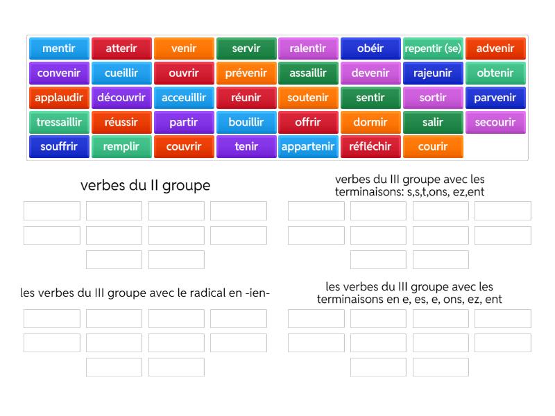 verbes du II groupe: obéir, remplir, ralentir, atterir, réunir, salir, réussir, réfléchir, applaudir, rajeunir, verbes du III groupe avec les terminaisons: s,s,t,ons, ez,ent: sortir, partir, dormir, servir, sentir, mentir, bouillir, repentir (se), courir, secourir, les verbes du III groupe avec le radical en -ien-: venir, tenir, obtenir, soutenir, devenir, prévenir, appartenir, parvenir, advenir, convenir, les verbes du III groupe avec les terminaisons en e, es, e, ons, ez, ent: offrir, ouvrir, couvrir, découvrir, souffrir, cueillir, acceuillir, tressaillir, assaillir ,