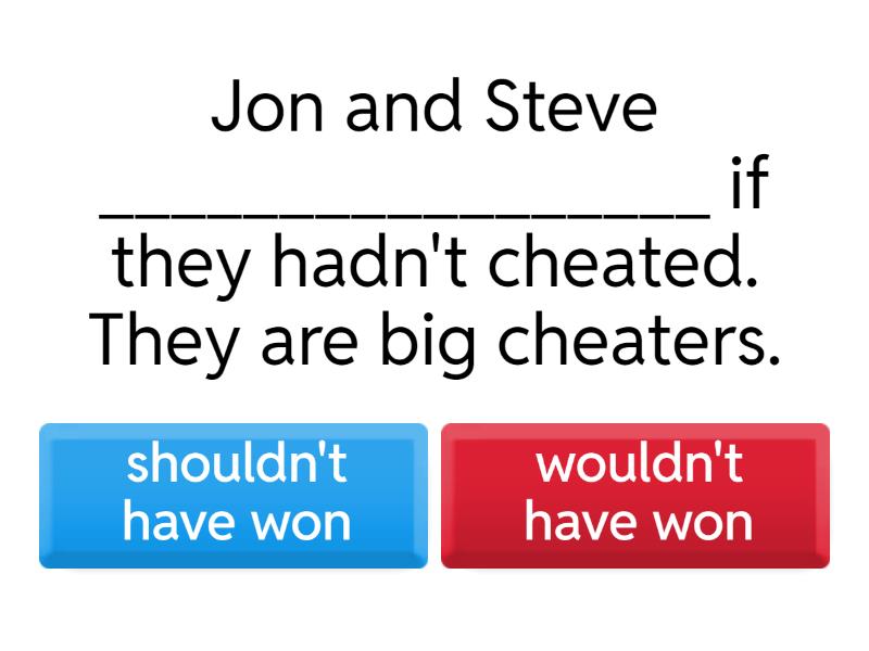 1) Jon and Steve _________________ if they hadn't cheated. They are big cheaters. a) shouldn't have won b) wouldn't have won 2) He ___________________ the promotion if his father weren't the vice president. a) can't have got b) wouldn't have gotten 3) Mary is not here. She ___________________ the house before we arrived a) may have left b) will have left 4) I didn't find my car in the garage. My brother ____________________ it. a) should have taken b) must have taken 5) You ________________ to bed earlier. You look tired today. a) might have gone b) should have gone 6) I am sorry! I _________________ that.  a) I would have said b) I shouldn't have said 7) He is late for this appointment. His train ___________________ delayed. a) might have been b) should has been 8) She _________________ out with her friends but she chose to stay at home instead. a) would have went b) could have gone