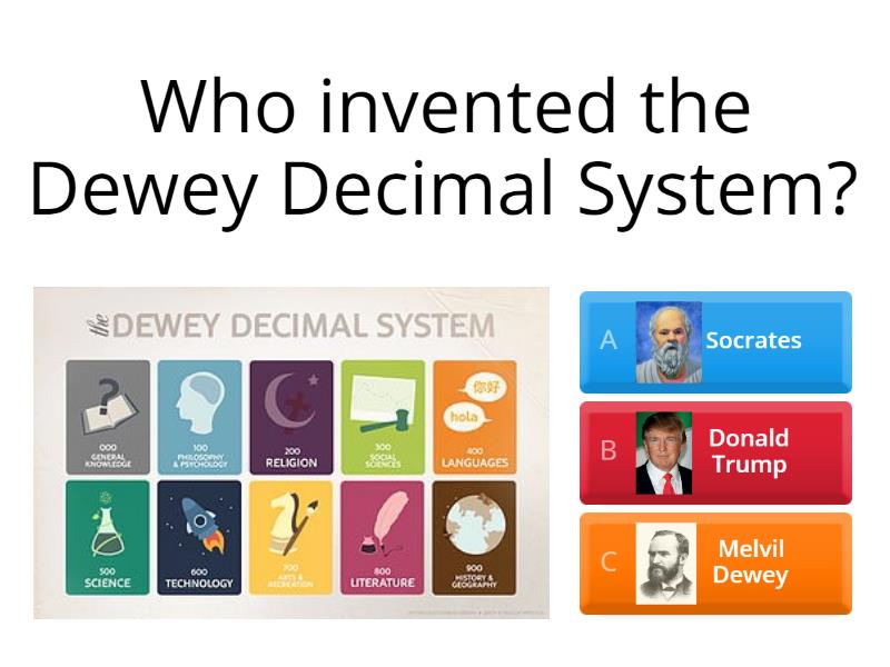 1) Who invented the Dewey Decimal System? a) Socrates b) Donald Trump c) Melvil Dewey 2) How many categories in the Dewey Decimal System? a) 2 Categories b) 10 categories c) 5 categories 3) Which type of information does the Dewey Decimal System organizes? a) The Fiction Information b) The Non-fiction Information 4) In which category will you find information about managing emotions? a) 100 - Philosophy and Psychology b) 200 - Religion and Mythology c) 000 - General Works d) 300 - Social Sciences 5) In which category will you find information about Biblical stories such as Noah's Ark? a) 100 - Philosophy and Psychology b) 200 - Religion and Mythology c) 000 - General Works d) 300 - Social Sciences 6) In which category will you find information about how to use the computer? a) 100 - Philosophy and Psychology b) 200 - Religion and Mythology c) 000 - General Works d) 300 - Social Sciences 7) In which category will you find information about unexplained mysteries such as Aliens? a) 100 - Philosophy and Psychology b) 200 - Religion and Mythology c) 000 - General Works d) 300 - Social Sciences 8) In which category will you find information about saving the environment through recycling? a) 100 - Philosophy and Psychology b) 200 - Religion and Mythology c) 000 - General Works d) 300 - Social Sciences 9) In which category will you find information about making friends and building relationships? a) 100 - Philosophy and Psychology b) 200 - Religion and Mythology c) 000 - General Works d) 300 - Social Sciences 10) In which category will you find information about the United States government and voting rights? a) 100 - Philosophy and Psychology b) 200 - Religion and Mythology c) 000 - General Works d) 300 - Social Sciences 11) In which category will you find information about using public transportation? a) 100 - Philosophy and Psychology b) 200 - Religion and Mythology c) 000 - General Works d) 300 - Social Sciences 12) In which category will you find true information about a person? a) 000 - General Works b) 300 - Social Sciences c) 92 - Biography d) 200 - Religion and Mythology 13) BONUS - what is the call number for fairy tales? a) 555.5 b) 398.2 c) 636.7 d) 005.1 14) BONUS - what is the call number for graphic novels? a) 398.2 b) 200 c) 636.7 d) 741.5