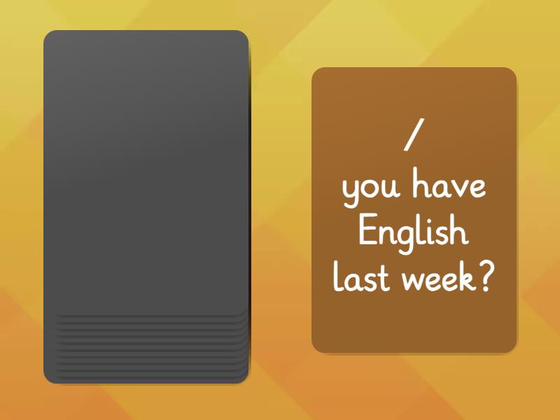 / you go to bed late yesterday?, / you play football at the weekend?, / your mum go shopping yesterday?, / your dad work last Sunday?, / you do your homework yesterday?, / you have English last week?, / you play computer games last weekend?, / your mum cook dinner yesterday?, / you have a good day at school today?, / you use a calculator today?, / you use a dictionary today?, / you wear a PE kit today?.