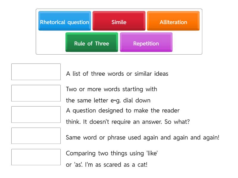 Alliteration - Two or more words starting with the same letter e.g. dial down, Simile - Comparing two things using 'like' or 'as'. I'm as scared as a cat!, Repetition - Same word or phrase used again and again and again!, Rule of Three - A list of three words or similar ideas  , Rhetorical question - A question designed to make the reader think. It doesn't require an answer. So what?,