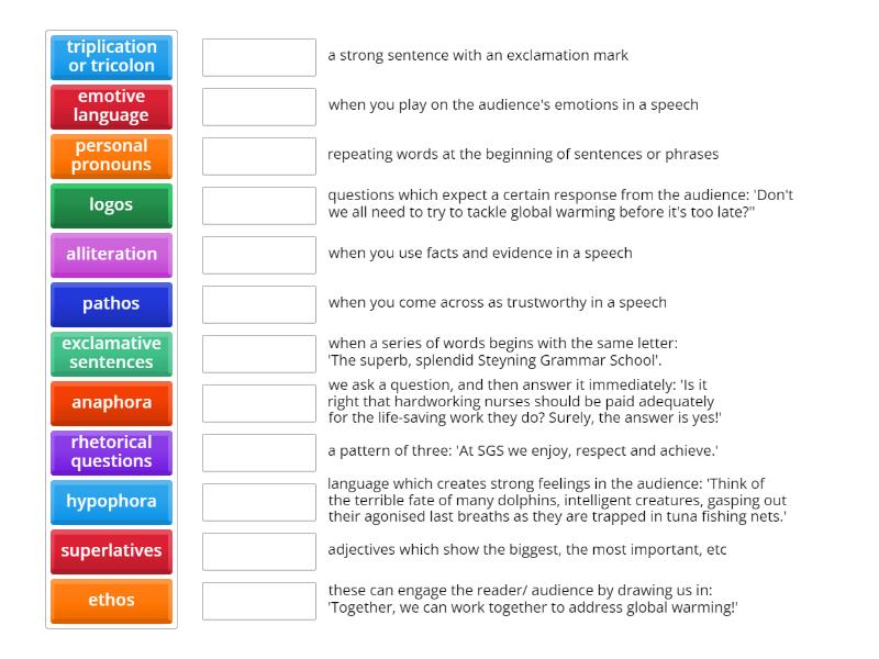 alliteration - when a series of words begins with the same letter: 'The superb, splendid Steyning Grammar School'., anaphora - repeating words at the beginning of sentences or phrases, rhetorical questions - questions which expect a certain response from the audience: 'Don't we all need to try to tackle global warming before it's too late?'', hypophora - we ask a question, and then answer it immediately: 'Is it right that hardworking nurses should be paid adequately for the life-saving work they do? Surely, the answer is yes!', emotive language - language which creates strong feelings in the audience: 'Think of the terrible fate of many dolphins, intelligent creatures, gasping out their agonised last breaths as they are trapped in tuna fishing nets.', exclamative sentences - a strong sentence with an exclamation mark, superlatives - adjectives which show the biggest, the most important, etc, triplication or tricolon - a pattern of three: 'At SGS we enjoy, respect and achieve.', personal pronouns - these can engage the reader/ audience by drawing us in: 'Together, we can work together to address global warming!', ethos - when you come across as trustworthy in a speech, logos - when you use facts and evidence in a speech, pathos - when you play on the audience's emotions in a speech,