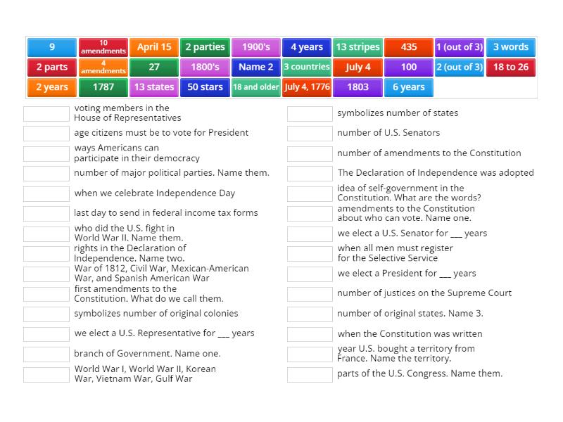 27 - number of amendments to the Constitution, 2 (out of 3) - rights in the Declaration of Independence. Name two., 1 (out of 3) - branch of Government. Name one., 2 parts - parts of the U.S. Congress. Name them., 100 - number of U.S. Senators, 6 years - we elect a U.S. Senator for ___ years, 435 - voting members in the House of Representatives, 2 years - we elect a U.S. Representative for ___ years, 4 years - we elect a President for ___ years, 18 and older - age citizens must be to vote for President, April 15 - last day to send in federal income tax forms, 18 to 26 - when all men must register for the Selective Service, July 4, 1776 - The Declaration of Independence was adopted, 13 states - number of original states. Name 3., 1787 - when the Constitution was written, 1800's - War of 1812, Civil War, Mexican-American War, and Spanish American War, 1900's - World War I, World War II, Korean War, Vietnam War, Gulf War, 13 stripes - symbolizes number of original colonies, 50 stars - symbolizes number of states, July 4 - when we celebrate Independence Day, 3 words - idea of self-government in the Constitution. What are the words?, 9 - number of justices on the Supreme Court, 2 parties - number of major political parties. Name them., 4 amendments - amendments to the Constitution about who can vote. Name one., 1803 - year U.S. bought a territory from France. Name the territory., 3 countries - who did the U.S. fight in World War II. Name them., 10 amendments - first amendments to the Constitution. What do we call them., Name 2 - ways Americans can participate in their democracy,