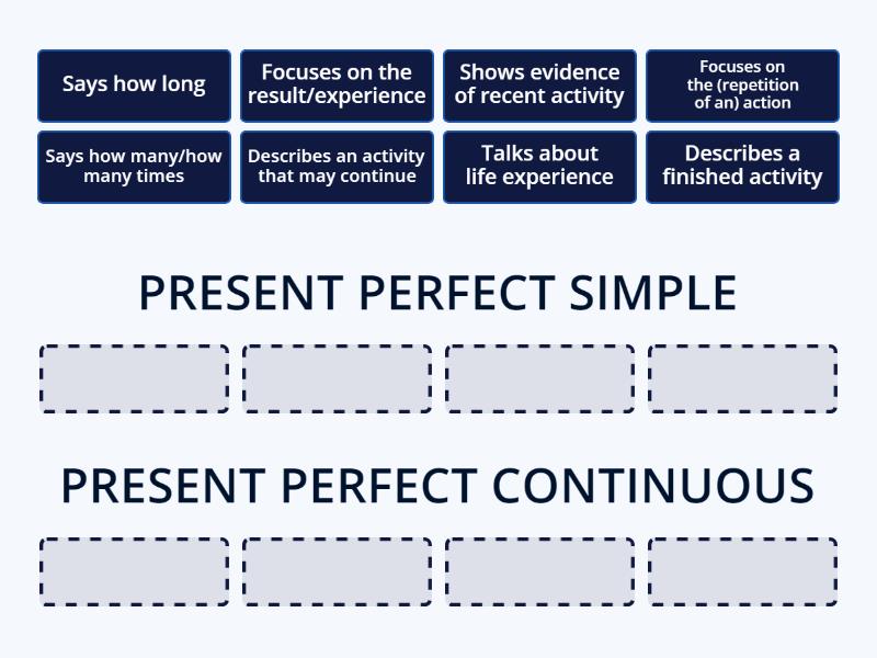 PRESENT PERFECT SIMPLE: Talks about life experience, Says how many/how many times, Focuses on the result/experience, Describes a finished activity, PRESENT PERFECT CONTINUOUS: Describes an activity that may continue, Says how long, Focuses on the (repetition of an) action, Shows evidence of recent activity,
