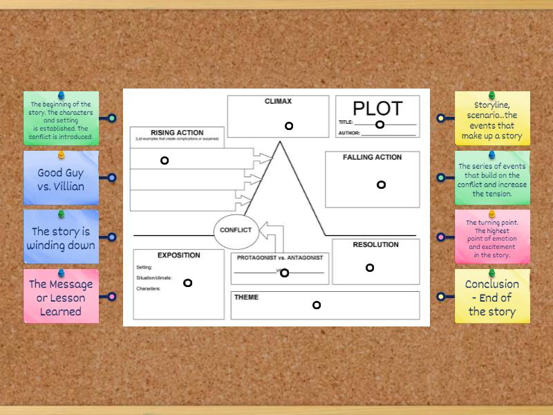 The series of events that build on the conflict and increase the tension., The turning point. The highest point of emotion and excitement in the story., The story is winding down, Conclusion - End of the story , The beginning of the story. The characters and setting is established. The conflict is introduced., The Message or Lesson Learned, Good Guy vs. Villian, Storyline, scenario...the events that make up a story.