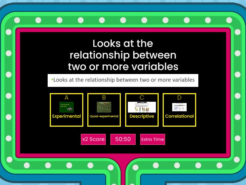 1) It is a design where exploratory in nature. The purpose is basically to answer questions such as who, what, where, when, and how much. a) a. Descriptive b) b. Correlational c) Experimental d) Quasi-Experimental 2) It refers to the group subjected to treatment or intervention. a) Control group b) Independent variable c) Treatment group d) Dependent variable 3) Looks at the relationship between two or more variables a) Experimental b) Quasi-experimental c) Descriptive d) Correlational 4) A design that used to control/manipulate of at least one independent variable. a) Correlational b) Experimental c) Ex Post Facto d) Quasi-experimental 5) Is defined as the logical and coherent overall strategy that the researcher uses to integrate all the components of the research study. a) Correlational b) Blueprint c) Research Design d) Literature Review