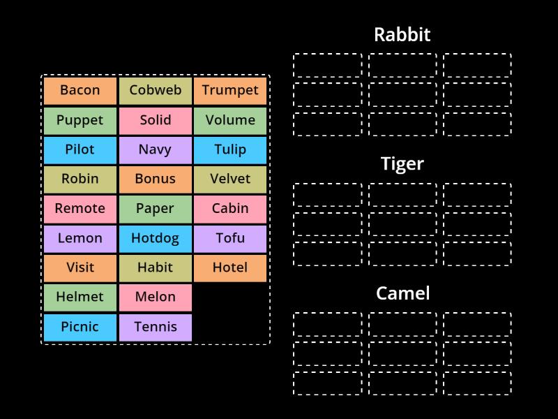 Rabbit: Trumpet, Velvet, Helmet, Cobweb, Picnic, Hotdog, Puppet, Tennis, Tiger: Tulip, Bacon, Hotel, Paper , Remote, Pilot, Tofu, Navy, Bonus, Camel: Lemon, Solid, Visit, Robin, Cabin, Habit, Melon, Volume,