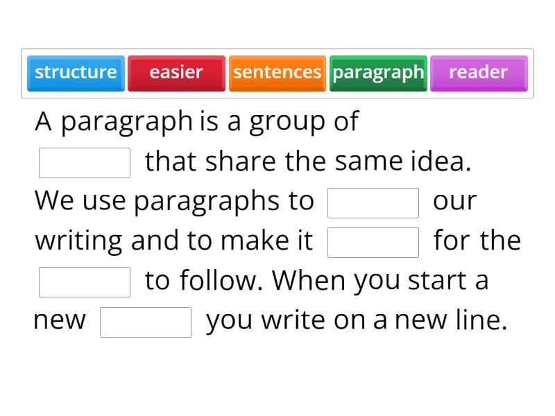A paragraph is a group of ____ that share the same idea. We use paragraphs to ____ our writing and to make it ____ for the ____ to follow. When you start a new ____ you write on a new line. When writing paragraphs, it’s helpful to use ____ words or phrases to help the ____ make sense of your whole text. If you’re writing about something that’s happened in the ____, you can use phrases to link ____ over a period of time. A topic sentence gives you the main ____ in a paragraph. It’s often (but not always) the first sentence in a paragraph. For example, if you’re ____ about travel and you want to write a ____ about how much travel has changed over the years, you could start your paragraph with a general statement, such as Travel has changed completely in the last hundred years. This is your ____ sentence.
