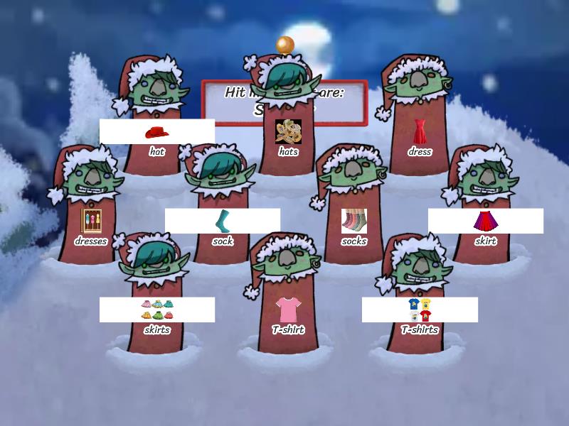 Singular: hat, dress, sock, skirt, T-shirt, coat, shoe, cap, Plural: hats, dresses, socks, skirts, T-shirts, coats, shoes, caps,