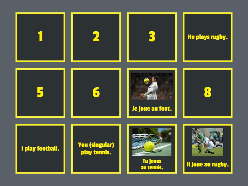 Je joue au foot. - I play football., Tu joues au tennis. - You (singular) play tennis., Il joue au rugby. - He plays rugby., Elle joue au handball. - She plays handball., Nous jouons au foot. - We play football., Je joue au basket. - I play basketball.,