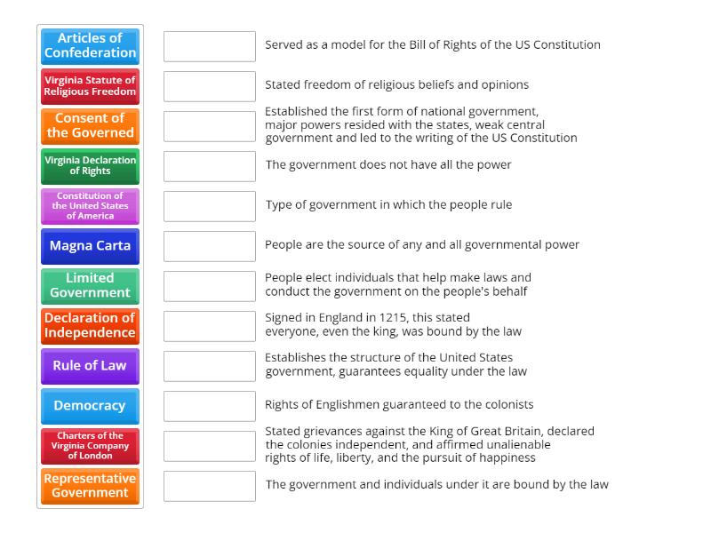 Consent of the Governed - People are the source of any and all governmental power, Limited Government - The government does not have all the power, Rule of Law - The government and individuals under it are bound by the law, Democracy - Type of government in which the people rule, Representative Government - People elect individuals that help make laws and conduct the government on the people's behalf, Charters of the Virginia Company of London - Rights of Englishmen guaranteed to the colonists, Virginia Declaration of Rights - Served as a model for the Bill of Rights of the US Constitution, Virginia Statute of Religious Freedom - Stated freedom of religious beliefs and opinions , Declaration of Independence - Stated grievances against the King of Great Britain, declared the colonies independent, and affirmed unalienable rights of life, liberty, and the pursuit of happiness, Articles of Confederation - Established the first form of national government, major powers resided with the states, weak central government and led to the writing of the US Constitution, Constitution of the United States of America - Establishes the structure of the United States government, guarantees equality under the law, Magna Carta - Signed in England in 1215, this stated everyone, even the king, was bound by the law,