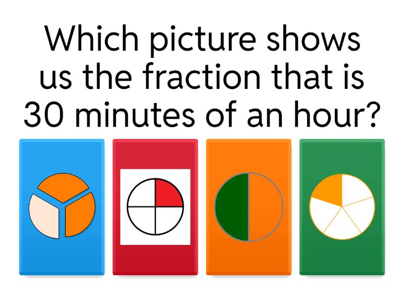 1) Which picture shows us the fraction that is 30 minutes of an hour? a) b) c) d) 2) how much of this pizza is missing? a) 1/8 b) 1/2 c) 1/4 d) 1/12 3) what fraction of the whole is shown? a) 4/7 b) 3/7 c) 7/7 d) 2/7 4) Which statement is true? a) 1/2 is the same as 2/4 b) 1/2 is more than 2/4 c) 1/2 is less than 2/4 5) There are 60 minutes in a day. How many minutes is a Quarter hour? a) 5 b) 10 c) 15 d) 60 6) how many 2x2 blocks are equal to a 2x4 block? a) 1 b) 2 c) 3 d) 4 7) how many 1x4 blocks are equal to a 2x4 block a) 1 b) 2 c) 3 d) 4 8) if I ate one slice of this pizza, how much would be left? a) a half b) three quarters c) seven eigths d) two thirds 9) When I cut an orange in half, how many pieces do I have? a) 1 b) 2 c) 3 d) 4 10) When I cut a lemon in quarters, how many pieces do I have? a) 1 b) 2 c) 3 d) 4 11) There are 24 hours in a day. 12 hours is how much of the day? a) the whole day b) half the day c) a third of the day d) a quarter of the day 12) There are 24 hours in a day. 6 hours is how much of the day? a) the whole day b) half the day c) a third of the day d) a quarter of the day 13) There are 24 hours in a day. 4 hours is how much of the day? a) half the day b) a third of the day c) a sixth of the day d) an eighth of the day 14) There are 24 hours in a day. 8 hours is how much of the day? a) half the day b) a third of the day c) a quarter of the day d) an eighth of the day 15) What time is shown on the clock? a) 14:00 b) 3 o'clock c) half past 2 d) 12:00 16) What time is shown on the clock? a) half past 2 b) quarter past 2 c) 2 o'clock d) quarter to 3
