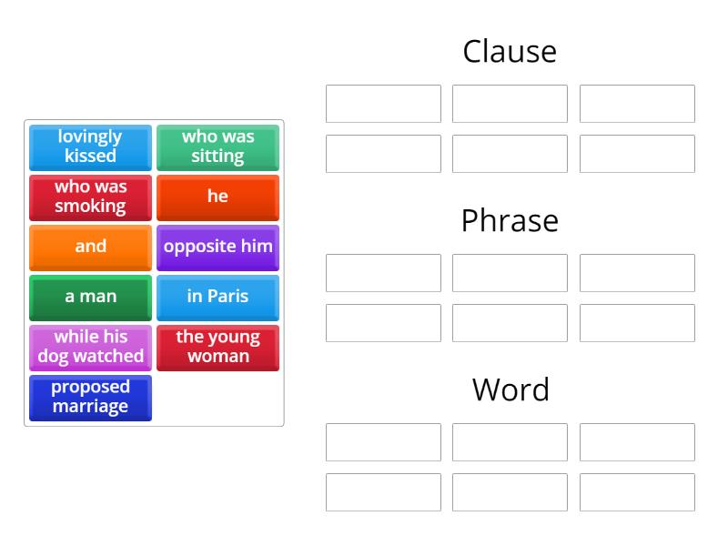 Clause: who was smoking, while his dog watched, who was sitting, Phrase: opposite him, the young woman, a man, in Paris, lovingly kissed, proposed marriage, Word: and, he,