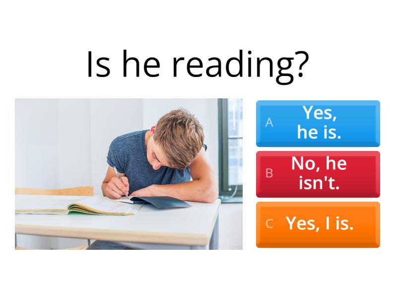 1) Is he reading? a) Yes, he is. b) No, he isn't. c) Yes, I is. 2) Is she listening to music? a) No, she is. b) Yes, you is. c) Yes, she is. 3) Is he riding a bike? a) Yes, it is. b) Yes, he is. c) No, he isn't. 4) Is she sleeping? a) No, she. b) Yes, she is. c) No, she isn't. 5) Is it swimming? a) Yes, it is. b) Yes, she is. c) No ,it isn't. 6) Are they riding horses? a) Yes, they are. b) No, they aren't. c) No, they are. 7) Are they doing homework? a) No, they are. b) No. c) No, we aren't. 8) Is she talking on phone? a) Yes, she. b) Yes, she is. c) Yes, she isn''t. 9) Is he climbing the wall? a) No. b) No, he isn't. c) No, he is. 10) Are they driving car? a) Yes, b) Yes, they are. c) Yes, they are not.