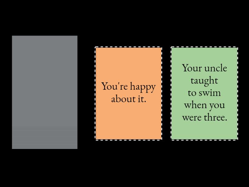 You were offered a good job in London but you turned it down., You're unhappy about it., You were offered a place at university but took a job instead., You're unhappy about it., You failed your exams at school., You're unhappy about it., You always wanted to travel but you ended up getting a job in your hometown., You're unhappy about it., You went to India for a holiday., You're happy about it., You got interested in archaeology when you went to Greece., You're happy about it., You went to a party last night., You're unhappy about it., Your parents took you to Australia when you were five., You're happy about it., You went on a rock climbing course., You're unhappy about it., Your uncle taught you to swim when you were three., You're happy about it..