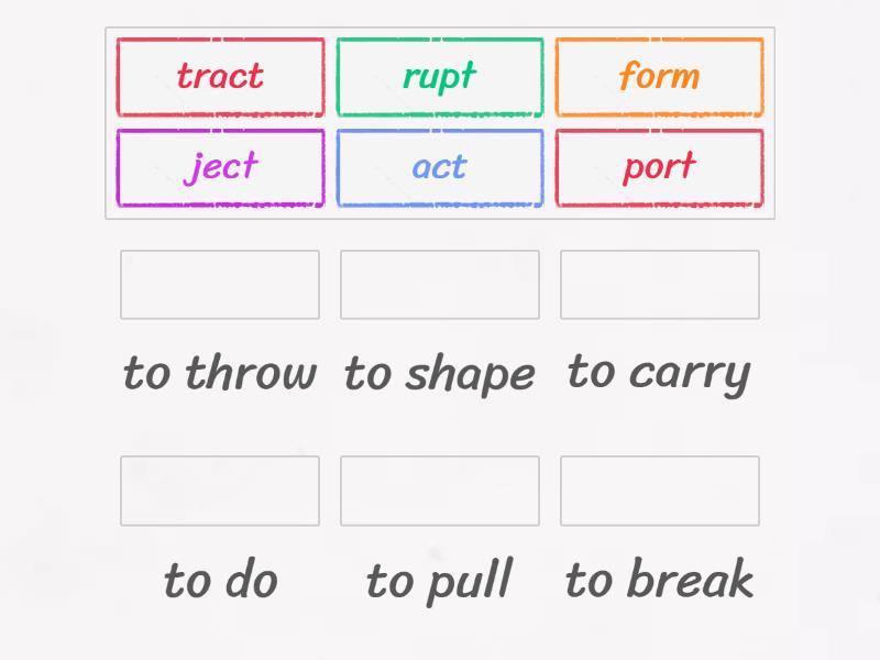 port - to carry, ject - to throw, tract - to pull, rupt - to break , form - to shape, act - to do ,