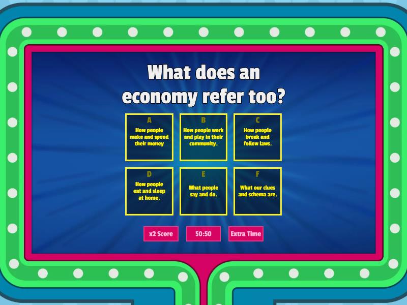 1) What does an economy refer too? a) How people make and spend their money b) How people work and play in their community. c) How people break and follow laws. d) How people eat and sleep at home. e) What people say and do. f) What our clues and schema are. 2) Our economy has to do with how many _____ and ______ it produces. a) toys and food b) friends and foes c) good and bad d) goods and services e) money and jobs f) help and support 3) Our economy's success is also based on how much _______ people have to spend on goods and services. a) time b) thought c) care d) consumer e) producer f) money 4) All of our goods and services are produced by... a) people b) money c) resources d) thoughts e) government officials f) police 5) How many kinds of resources are there? a) 5 b) 3 c) 2 d) 1 e) 9 f) 7 6) Which type of resource is produced in the outdoors and happens naturally? a) Capital b) Human c) Boogial d) Chemical e) Natural f) Tropical 7) Which type of resource is made up of people doing jobs? a) Capital b) Human c) Boogial d) Chemical e) Natural f) Tropical 8) Which type of resource is used to make other resources? Things like machines, buildings, and tools. a) Capital b) Human c) Boogial d) Chemical e) Natural f) Tropical 9) What is a producer? a) Something you can hold and buy. b) Someone who makes things. c) Someone who cares a lot about the environment. d) Someone who works from home. e) Something that is made in nature. f) Something heavy with a lot of color. 10) What is a consumer? a) Someone who buys things. b) Someone who works hard. c) Someone who cares a lot about the community. d) Someone who provides a service.  e) Someone who reads well. f) Something that has a lot of color. 11) Which option below is a good? a) teaching b) cutting hair c) playing guitar d) a guitar e) keeping people safe f) making people food 12) Which below is a service? a) a table b) a TV c) a playstation d) teaching kids e) paper f) A pencil 13) What is an economic choice? a) How people work. b) How people decide to spend their money. c) How people decide to spend their free time. d) How people decide where to work. e) How people do at work. f) How people express their needs. 14) Why do people make economic choices? a) To be nice to others. b) because you can do whatever you want c) because people need goods and services d) to help the government e) because you can't have everything you want f) to show people what you know 15) What is an opportunity cost? a) the thing you miss out on when you buy something b) the thing you want c) something you can hold and buy d) the thing you choose to buy e) the thing you like the most f) something you do for others