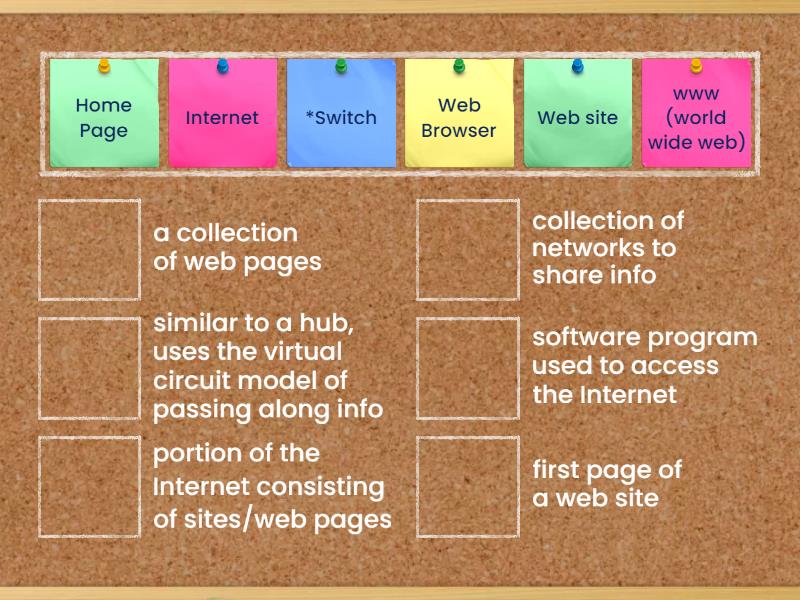 Internet - collection of networks to share info, ISP - company that gives access for a fee, *Network - system of computers and hardware connected together, Web Browser - software program used to access the Internet, Home Page - first page of a web site, top level domain - last part of the web address: .com/.edu/.gov, www (world wide web) - portion of the Internet consisting of sites/web pages , Web Page - a single web document within a website, Web site - a collection of web pages , *Network Interface Card (NIC) - aka network card, a circuit board/card that connects a device to a network, *Hub - used to connect multiple devices in a network, *Switch - similar to a hub, uses the virtual circuit model of passing along info,