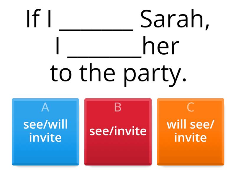 1) If I _______ Sarah, I _______her to the party. a) see/will invite b) see/invite c) will see/ invite 2) I _______ Martin, if I ______ to Manchester. a) visit/ will go b) will visit/go c) visit/go 3) If I ____Sarah, I ______her your message. a) meet/give b) meet/will give c) will meet / give 4) If I ______ home early, I _____ you for going out. a) get/phone b) get/will phone c) will get/phone 5) We would like to ask you to come holiday with us. But if you _____want to, you ______. a) don't/ don't have to b) didn't/ will c) don't/won't 6) She _____ her homework on time if she _______ her dinner late. a) won't do/finishes b) won't do/finish c) does/ finishes 7) If it _____ a nice day tomorrow, I ______to the beach. a) is/go b) is/will go c) will be/go 8) I think we arrive at 6:00 o'clock. But if we _____late, please ______for us. a) will be/wait b) will be/will wait c) are/wait 9) If he ______ me,I _____ help them. a) ask/help b) asks/will help c) ask/ will help 10) If it rains, I _______ at home. a) stay b) will stay c) stays 11) The prices _______ up like this, we __________ to buy a new house. a) go/won't afford b) go/afford c) will go/ don't afford 12) If we _______ everything on time, we _______our mother's birthday in her summer house. a) will manage/ celebrate b) manage/will celebrate c) manages/celebrates 13) If another meeting _____scheduled for Monday, we ____ work early. a) is/won't leave b) will be/don't leave c) isn't/ won't leave 14) If I go to the supermarket, I ________________. a) will have my lunch there. b) will buy some tomato sauce for pasta. c) will pay less money for dinner. 15) The government won't declare the new law for retirement if ________________. a) they delay the elections for new era. b) they set up new elections c) they give a raise in salaries. 16) If the students leave the university without graduating, _____________ a) there will be lots of unemployed around. b) they won't get a proper education for essential positions at work. c) they will waste their money.