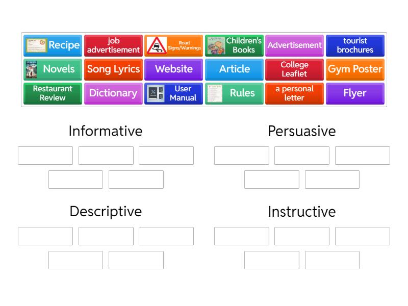 Informative: Article, Website, College Leaflet, Dictionary, job advertisement, Persuasive: Advertisement, Gym Poster, Restaurant Review, Flyer, tourist brochures, Descriptive: Novels, Song Lyrics, Children's Books, a personal letter, Instructive: Recipe, User Manual, Rules, Road Signs/Warnings,