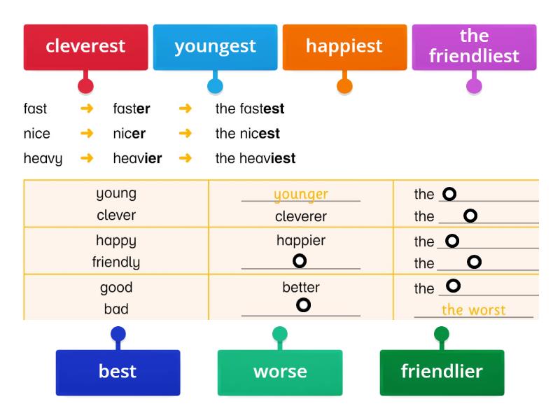 youngest, cleverest, happiest, friendlier, the friendliest, best, worse.