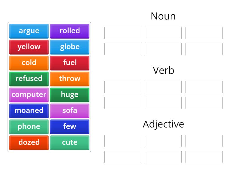 Noun: computer, fuel, globe, phone, sofa, Verb: argue, dozed, moaned, refused, rolled, throw, Adjective: cold, cute, few, huge, yellow,