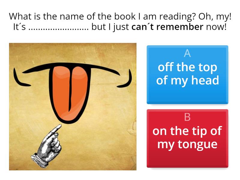 1) What is the name of the book I am reading? Oh, my! It´s ......................... but I just can´t remember now!  a) off the top of my head b) on the tip of my tongue 2) I was reading the new theory about the origin of life but ................................. ( can´t understand very well) a) I can´t make heads or tails of it b) I lost my train of thought 3) My grandson knows all the fifty states of the USA ............................ ( from memory) a) by head b) by heart 4) She needs some advice about what to do in this situation, however ............................ ( I can´t think of anything) a) nothing comes to my heart b) nothing comes to my mind 5) We have been through a lot during the Corona virus pandemic. I just hope we ...................................( learn something from it) a) get something out of it b) get something into it 6) She doesn´t ........................ of working so hard and not having any leisure time. ( not understand the motives, the reasons) a) stick to her mind b) see the point 7) The new song I listened to yesterday is incredible. It has .................................. ( just can´t forget it) a) come to grips b) sticked in my mind 8) The reason why some many people get into family trouble because of political ideas is............................ (more than I can understand) a) beyond me b) over me 9) I sometimes read books in Spanish, but sometimes  it can be hard to ............................ the language. ( to understand) a) know by heart b) get around  10) Will there be anything interesting to do on the weekend? ( from memory, without thinking very much) a) Off the top of my head, I can´t think of anything b) I don´t see the point.
