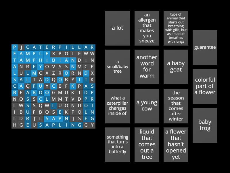 kid - a baby goat, calf - a young cow, balmy - another word for warm, sapling - a small/baby tree, bud - a flower that hasn't opened yet, pollen - an allergen that makes you sneeze, petals - colorful part of a flower, caterpillar - something that turns into a butterfly, cocoon - what a caterpillar changes inside of , spring - the season that comes after winter, ample - a lot, assure - guarantee, sap - liquid that comes out a tree, tadpole - baby frog, amphibian - type of animal that starts out breathing with gills, but as an adult breathes with lungs,