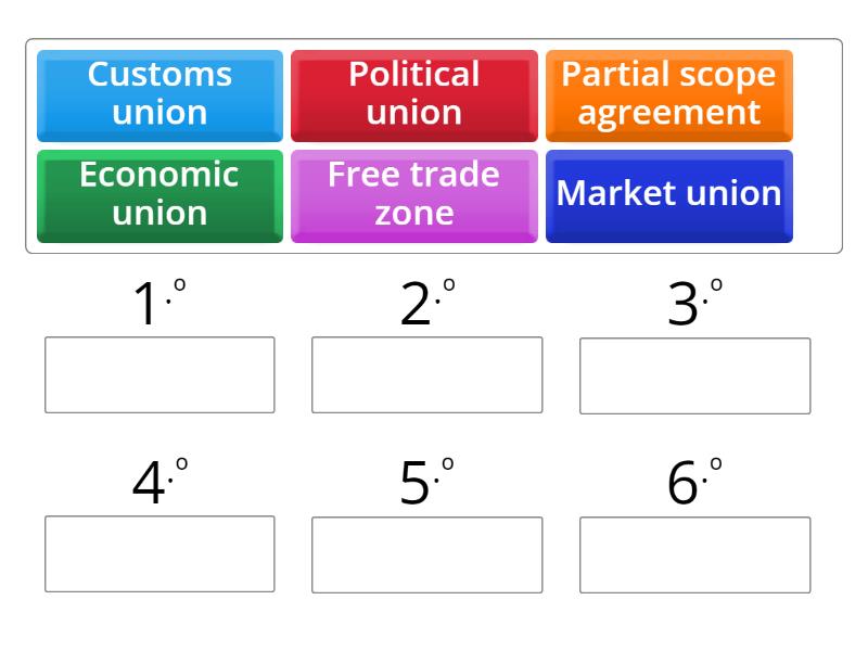 Partial scope agreement, Free trade zone, Customs union, Market union, Economic union, Political union.