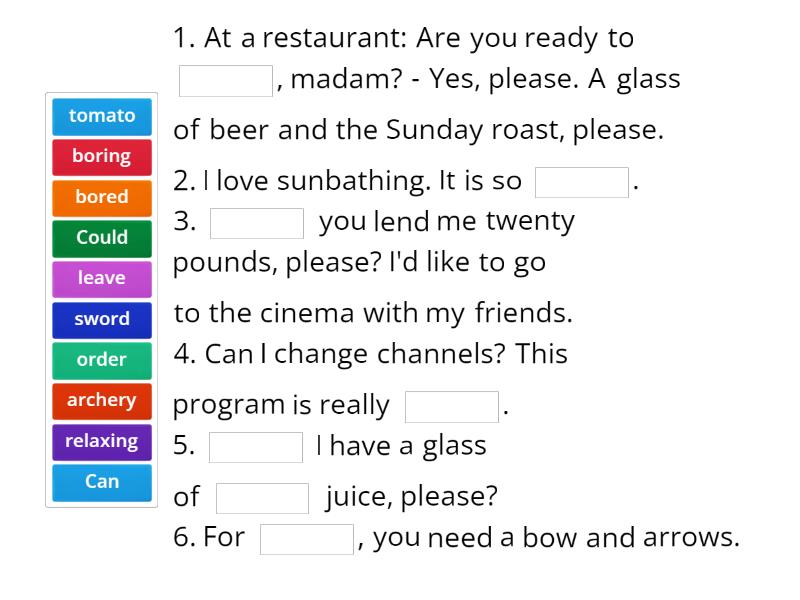 1. At a restaurant: Are you ready to ____, madam? - Yes, please. A glass of beer and the Sunday roast, please. 2. I love sunbathing. It is so ____. 3. ____ you lend me twenty pounds, please? I'd like to go to the cinema with my friends. 4. Can I change channels? This program is really ____. 5. ____ I have a glass of ____ juice, please? 6. For ____, you need a bow and arrows. Waiter: Are you ready ____, madam? Customer: ____, please. Waiter: What ____ you? Customer: ____ I have a chicken salad, please? Waiter: Do you want ____ with your salad? Customer: I'll ____ some chips. Waiter: Would you like anything ____? Customer: I'll ____ a glass of orange juice, please. Yes, thank you. And would you ____ bringing me a coffee, please? Waiter: Certainly. 1. I was so ____ when I fell of the climbing ladder in the playground. Imagine, in front of all my schoolmates! 2. The ice hockey was so slow last night. It seemed the teams didn't want to play at all. It was really ____! 3. I was ____ when the teacher announced the test. I didn't know about it! 1. I really don't mind ____ early. 2. In medieval times, body ____ was used to protect an individual from physical injury. 3. I often forget ____ my lunchbox to school. 4. ____ you give me a lift into town?