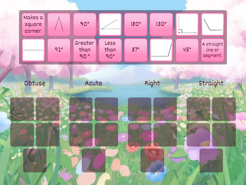 Obtuse: Greater than 90 °, 130°, , 92°, , Acute: Less than 90°, 45°, , 87°, , Right: Makes a square corner., 90°, , Straight: A straight line or segment., 180°, ,