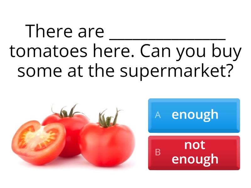 1) There are _______________ tomatoes here. Can you buy some at the supermarket? a) enough b) not enough 2) There are _____________ sausages on the plate. a) a little b) a few 3) I will stay in Taiwan for _____________ weeks. Do you want me to buy you a gift? a) a few b) a little 4) There's _____________ bread in the basket. It's so heavy! a) too much b) a few 5) I have watched this movie before! I know ____________ characters. a) a little b) a few