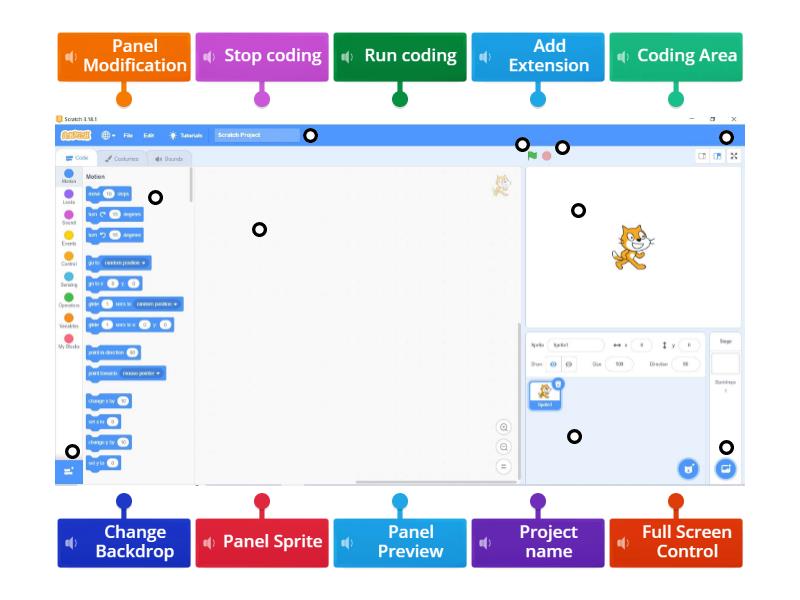 Panel Preview, Panel Sprite, Panel Modification, Run coding, Stop coding, Change Backdrop, Coding Area, Full Screen Control, Project name, Add Extension.